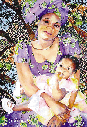| Finalist Receives award certificate: MARY-LEIGH DOYLE, Calgary, AB Butterflies Water and Mixed Media, 20x15" The mother and child portrayed here were so captivatingly colorful I found them irresistible," says Doyle, "I used African batik as the inspiration for the Iconic, placid expression on the young mother's face and the innocence of her child. They seemed like butterflies to me; exotic and fragile in the hustle and bustle of our world. I chose to do this piece in watercolor as it is the perfect medium to capture the glow of their skin and the vitality of the various fabrics. The addition of wax crayon and "gold leaf" helped to authenticate the look of the batik background. Doyle is an artist and instructor. She studied at the Ontario College of Art and Design. Portraits and still life are her passion. Now and then she dabbles in some printmaking mosaic or textile arts. You can contact the artist at m.l.doyleart@shaw.ca. |